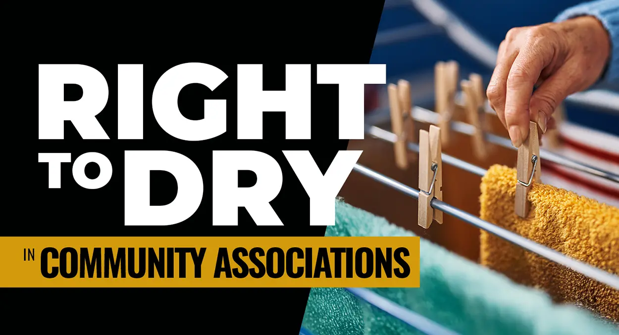 Text reads "Right to Dry in Community Associations" next to a hand hanging laundry with clothespins on a drying rack.